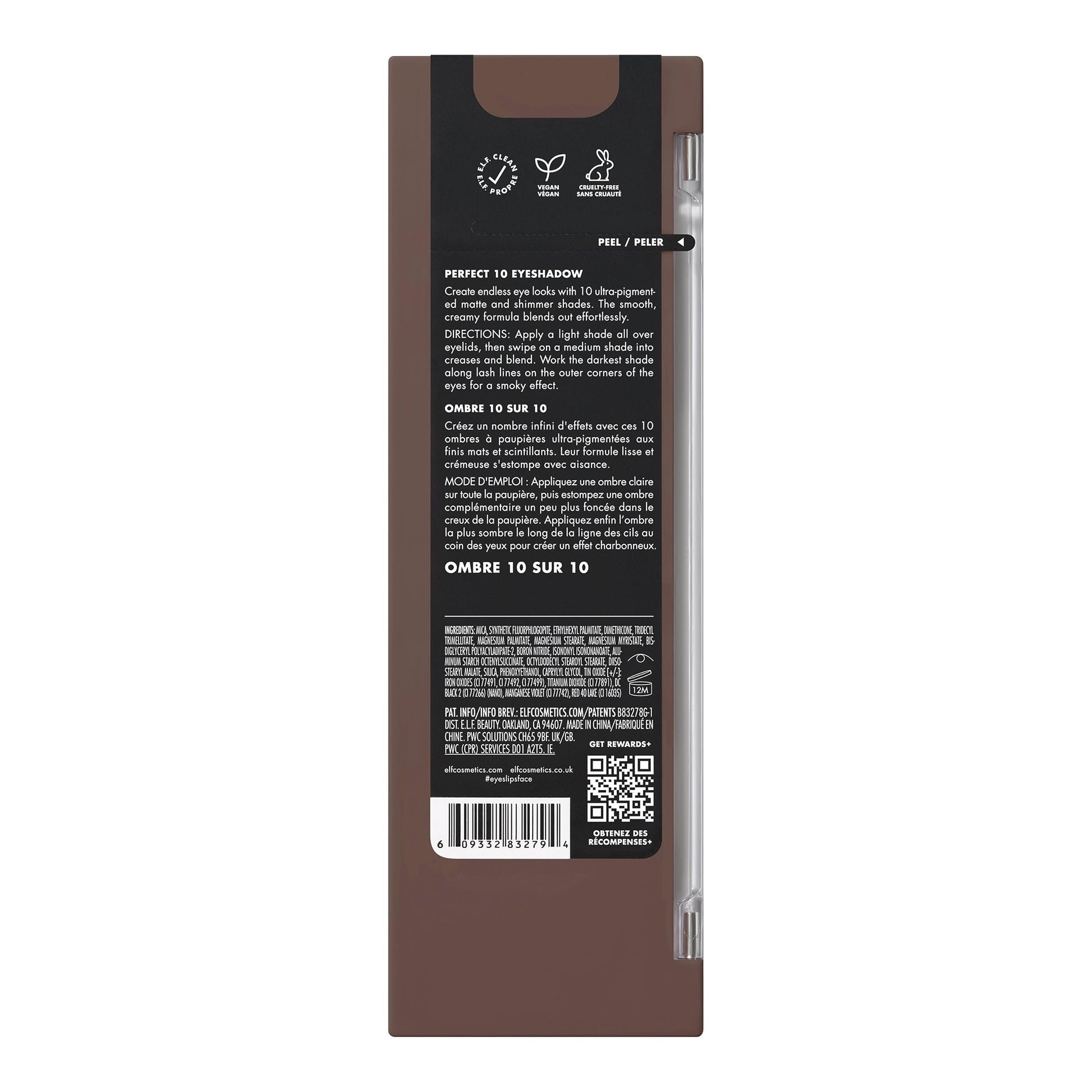 e.l.f. Perfect 10 Eyeshadow Palette, Ten Ultra-pigmented Nude Shades, Blendable Formula, Vegan & Cruelty-free, Everyday Smoky (Packaging May Vary)10 ULTRA-PIGMENTED SHADES: Make your eyes the prize with the e.l.f. Perfect 10 Eyeshadow Palette. Get inspired with this 10-color eye palette, perfect for creating a variety of eye-catching looks.SUBTLE, NUDE SHADES: Effortlessly enhance your eyes with these complementary eyeshadow shades. Subtle, nude tones highlight and brighten eyes while shades of bronze and deep brown sculpt and define for added depth.CREAMY, BLENDABLE FORMULA: The creamy powder formula applies silky smooth and blends with ease, delivering intense color payoff.CREATE INFINITE LOOKS: Features a versatile range of ultra-pigmented shades that invite you to play around and create a range of eyeshadow looks with multidimensional vibes.SKIN-LOVING INGREDIENTS: All e.l.f. products are made from skin-loving ingredients you want, minus the toxins you don’t—all at good-for-you prices. All e.l.f. products are 100% cruelty-free and Vegan.