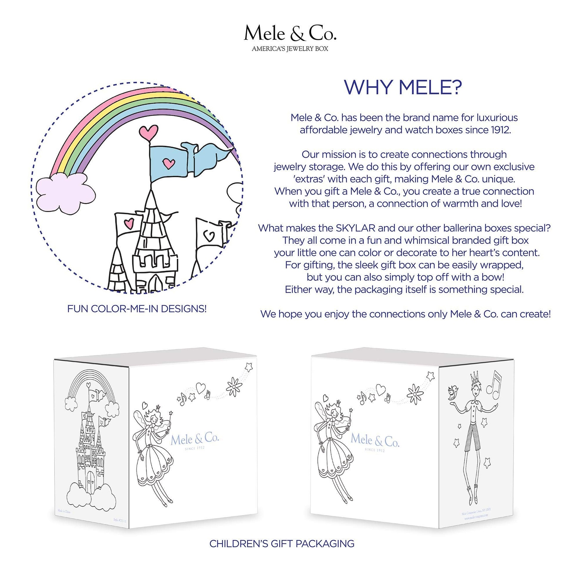 Simply adorable, the Mele and Co. Skylar girl's musical jewelry box will enchant with its wonder and whimsy. With a twirling unicorn and rainbow accents, this jewelry box is a dream come true! Mele & Co. decorated paper girl's musical jewelry box. Unicorn and rainbows fashion paper overlay. Lift lid with oval interior mirror. Twirling unicorn figurine. Plays "Waltz of the Flowers". Single compartment offers open area storage. Hand lined in pink sueded fabric. Decorative silver tone latch and hardware. 5 7/8" x 4 1/4" x 3 1/4".WHIMSICAL UNICORN DESIGN - embellished exterior will captivate your little one.MUSICAL MOVEMENT - plays "Waltz of the Flowers" when lid is opened.TWIRLING UNICORN - adorable unicorn figurine spins gracefully to the tune.Interior oval mirror - unique mirror with beaded detailing adds extra panache.PINK SUEDED INTERIOR - hand lined interior protects her keepsakes from scratches and abrasions.