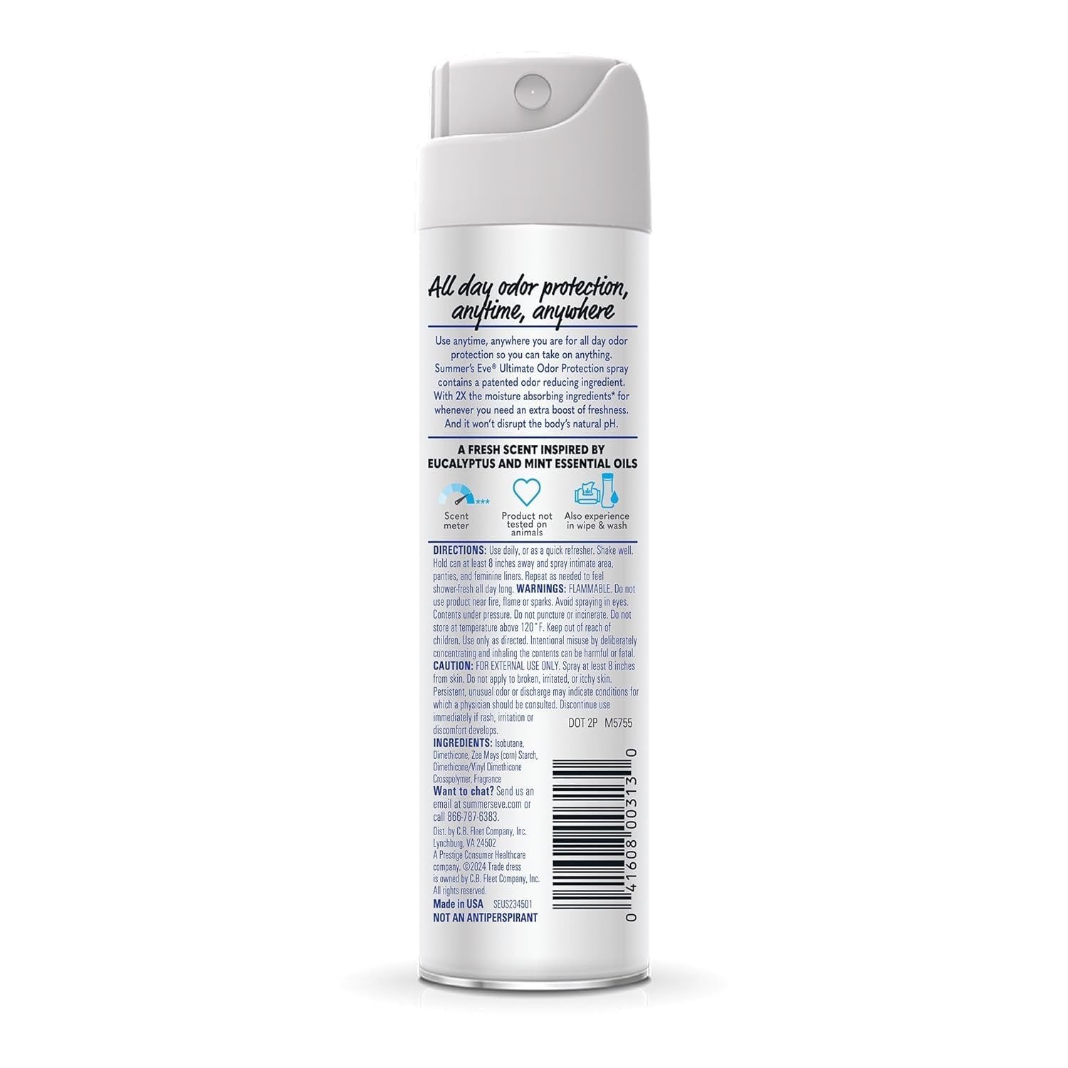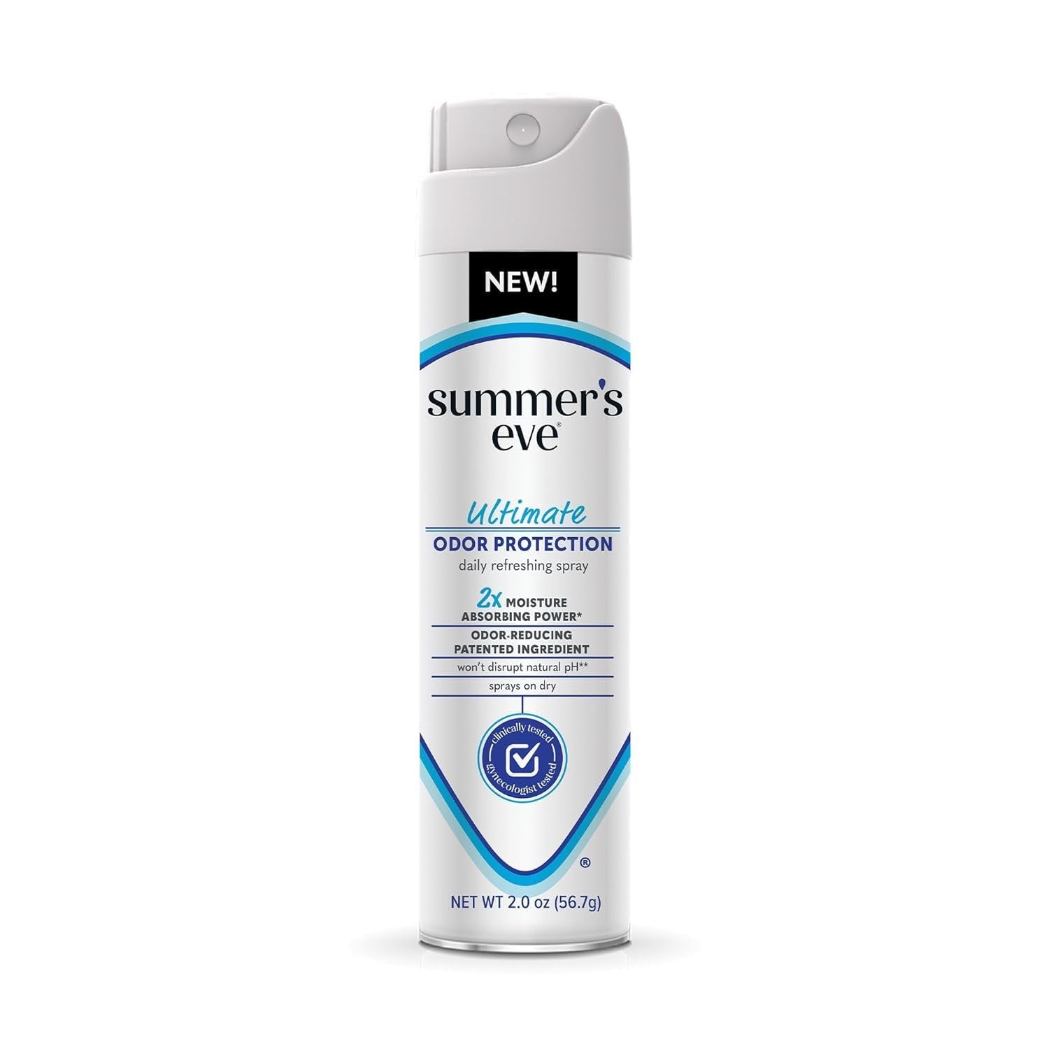 Summer’s Eve Ultimate Odor Protection Intimate Body Spray for Women contains a patented odor reducing ingredient. This unique spray formula absorbs 2x the moisture* from sweat, and sprays on dry for an extra boost of freshness whenever you need it. Summer’s Eve Ultimate Odor Protection intimate spray for women is a great moisture-absorbing feminine spray with twice the absorbing power of other Summer’s Eve sprays. Take your feminine care to the next level with a clinically-tested feminine spray that reduces odor without disrupting the natural pH range of a woman’s external intimate area. This fresh scent feminine spray is ideal for on-the-go odor control; keep in your purse, gym bag, or luggage to absorb moisture and eliminate vaginal odor while travelling to leave you feeling fresh and confident all day.