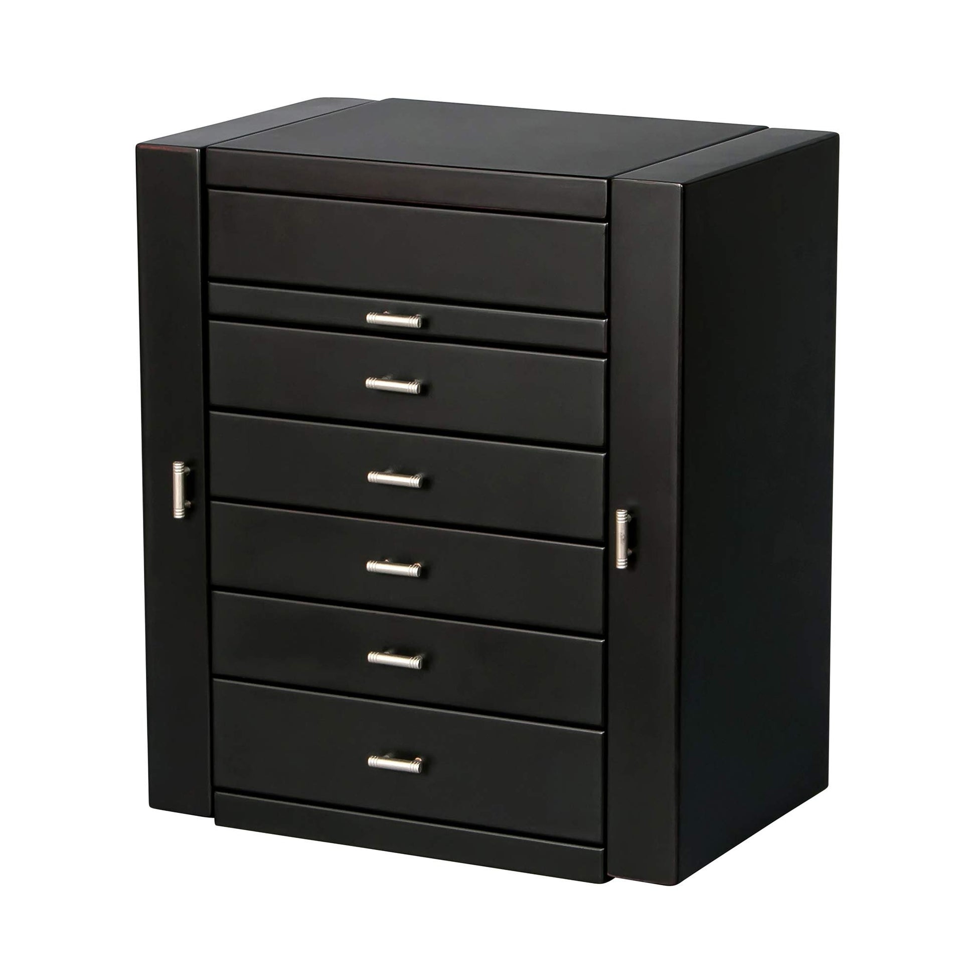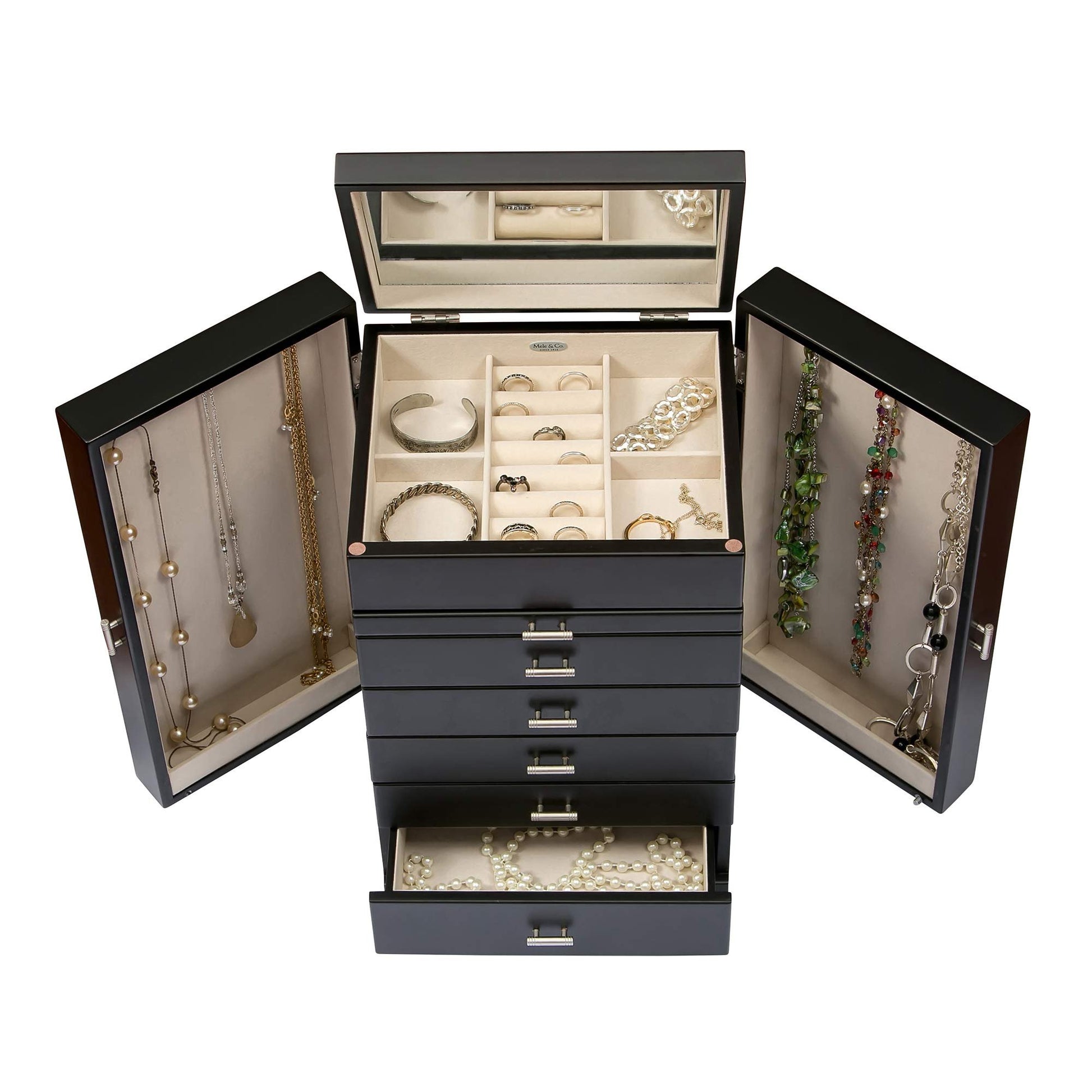 Mele & Co. 00879F13 Geneva Upright Wooden Jewelry BoxPull Out staging trayFive drawers in allOne drawer with divided storage, three with open area storage, one ring roll drawerDual Necklace doors with catch panels and five hooks eachBrushed aluminum tone drawer pulls and hardware