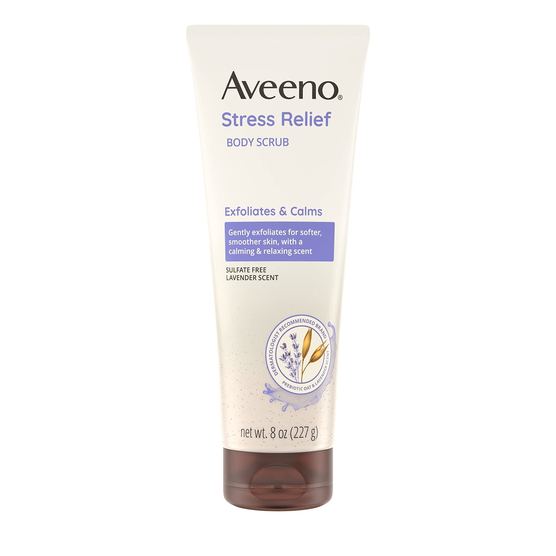 Aveeno Stress Relief Body Scrub, Exfoliating Body Wash for Softer, Smoother Skin, Formulated with Prebiotic Oat & Lavender Scent to Calm & Relax, Sulfate-Free & Soap-Free, 8 fl. oz8 oz bottle of Aveeno Stress Relief Exfoliating Body Scrub for women and men, gently exfoliates to reveal softer, smoother skin in just one week while the lavender scent leaves you feeling calm and relaxed in the showerThe natural exfoliant gently scrubs away dead surface layers for smoother skin, while the lavender scent leaves you feeling calm and relaxed in the showerThis gentle lavender scented body scrub features a formula made with prebiotic oat and is free of sulfates, parabens, dyes, and soapsUse 3-4 times per week for smoother skinFrom a dermatologist-recommended brand for over 70 years, Aveeno uses the goodness of nature and the power of science to keep skin healthy-looking and balanced