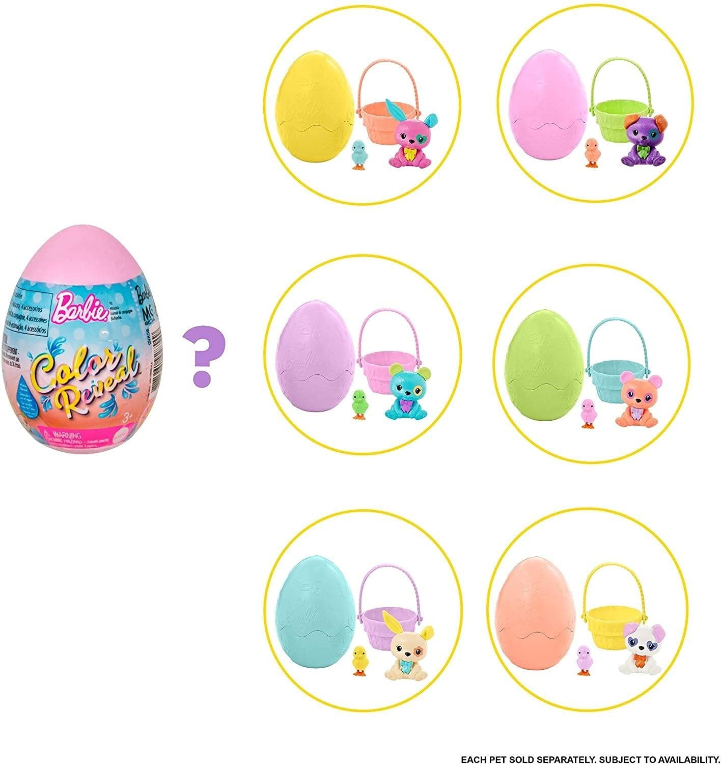 Mattel - Barbie Color Reveal Easter Egg, One Surprise Color Reveal with Each TransactionWith 5 surprises in 1 package, the Barbie Color Reveal pets deliver all kinds of delight!Each colorful pet set comes in an Easter egg container thats easy to open and close - whats inside Start the experience by opening the egg to find 4 bags with hidden contentsAfter opening each bag, kids will discover a Color Reveal pet covered in metallic purple, a baby chick, a basket and a set of pet ears!Use ice-cold water for a color-change transformation that can be repeated over and over again - reveal the pets surprise face decoration!