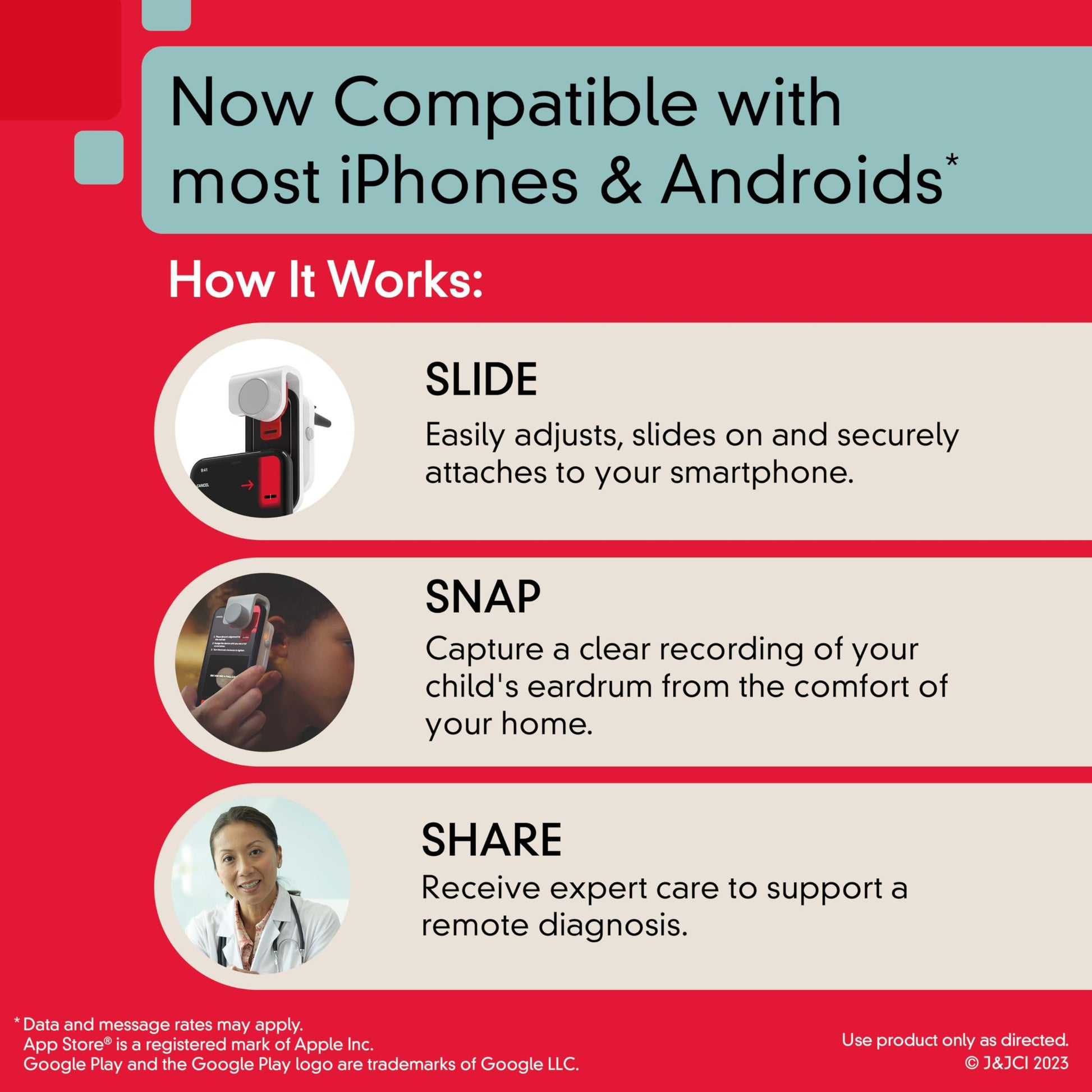 SMARTCHECK FROM CHILDREN’S TYLENOL: Use the SmartCheck app to review past recordings of your child's eardrums with your doctor to compare and track changes overtime; Download the app and slide otoscope clamp over phone camera to capture recordings.