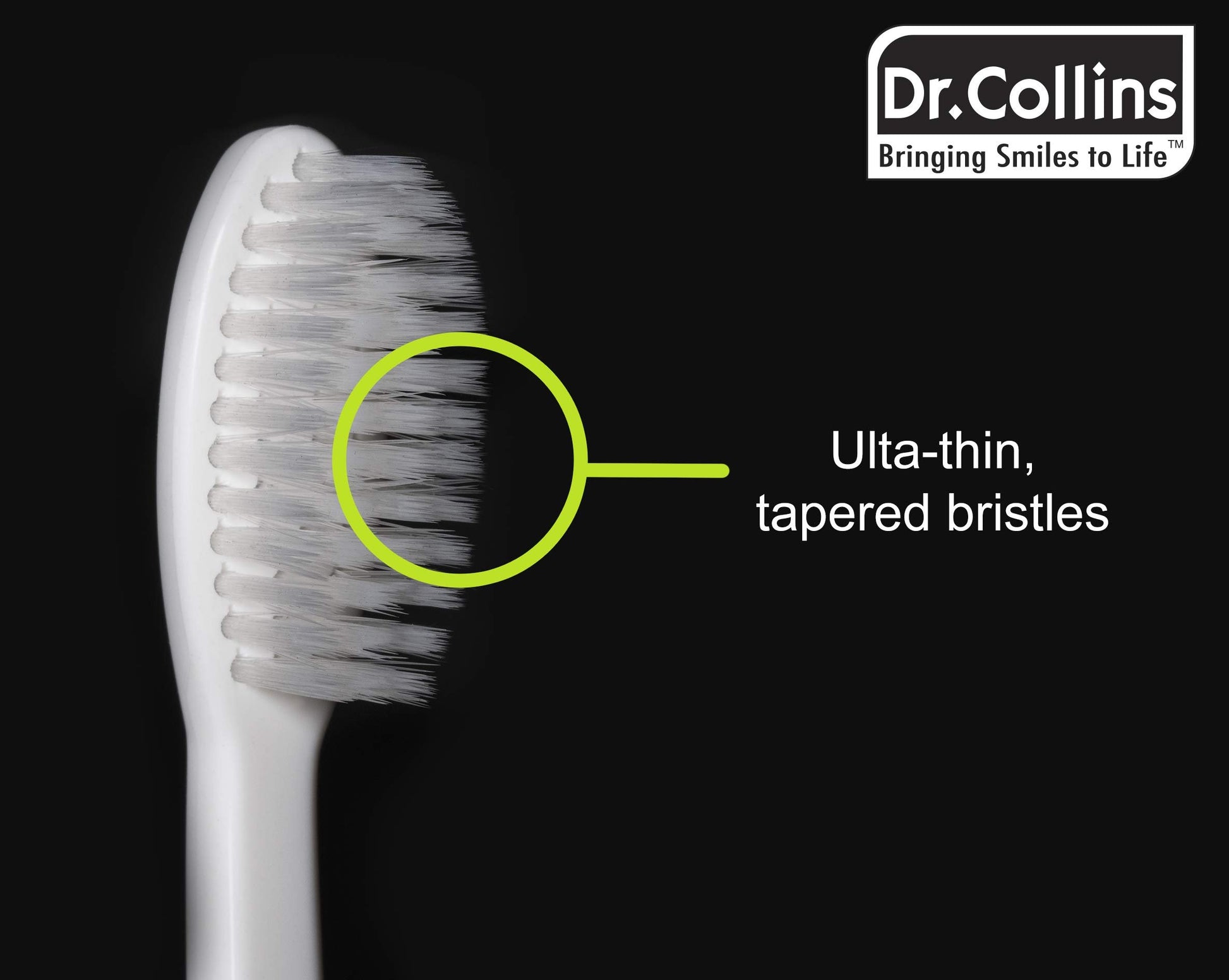 Dr. Collins Perio Toothbrush penetrates the areas between teeth and gums removing plaque and food particles, while gently massaging gums without pain and bleeding.