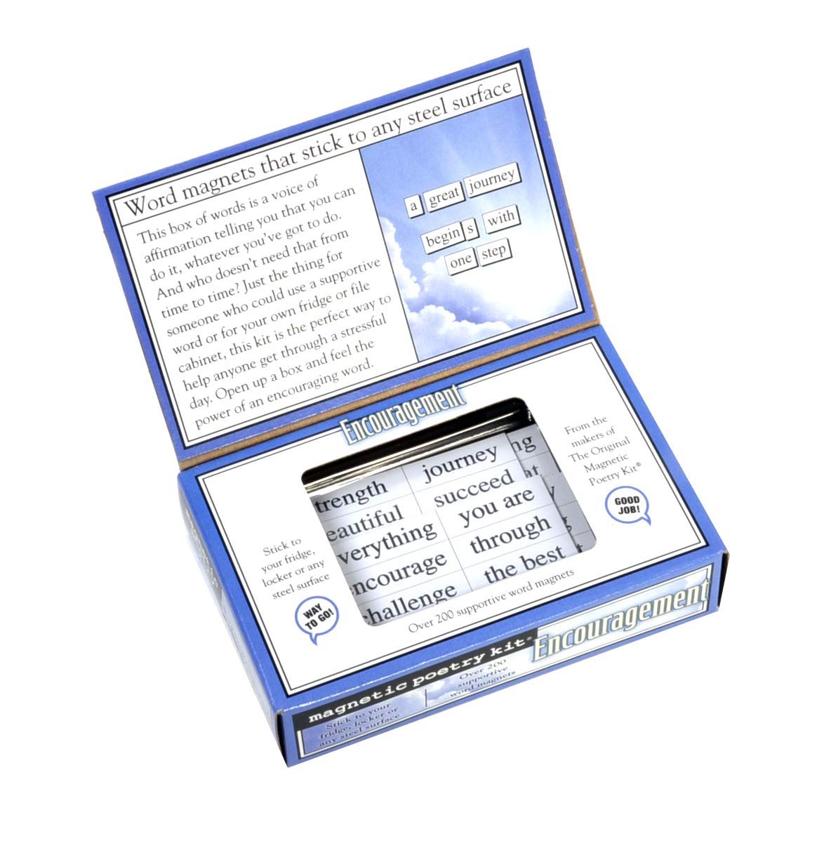 Item #3642Over 200 word magnets that will always believe in you. Includes words like journey, greatness, capable, achieve and encourage. Kit contains over 200 themed magnetic word tiles. Tile height is .375"Package size is 4.75w x 3h x 1.25"d. Made in USA.