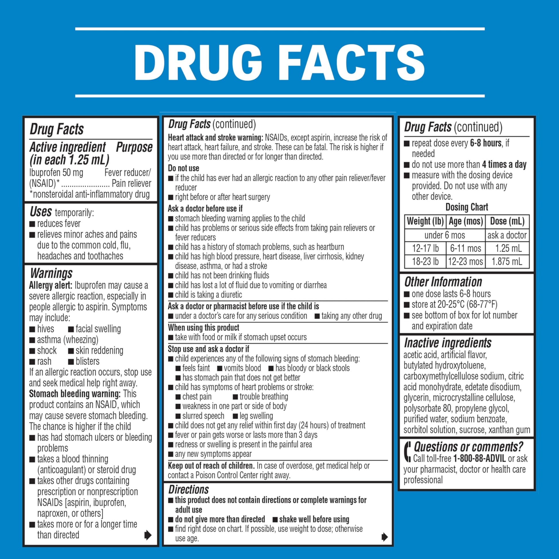 Infants' Advil Liquid Pain Reliever and Baby Fever Reducer, Infant Ibuprofen Dye Free Pain Relief and Fever Medicine, White Grape - 0.5 Fl Oz (2 Pack)Two 0.5 fluid ounce bottle of white grape flavored Infants' Advil Liquid Pain Reliever and Baby Fever Reducer, Infant Ibuprofen Dye Free Pain Relief and Fever MedicineDye free ibuprofen liquid medicine that reduces and controls fever; nothing has been proven to reduce fever faster or longerLiquid pain reliever baby medicine relieves minor aches and pains due to the common cold or teethingInfant Advil with a pleasant white grape flavor and a dye-free formulation that won't stain washablesBaby fever medicine for ages 6 to 23 months