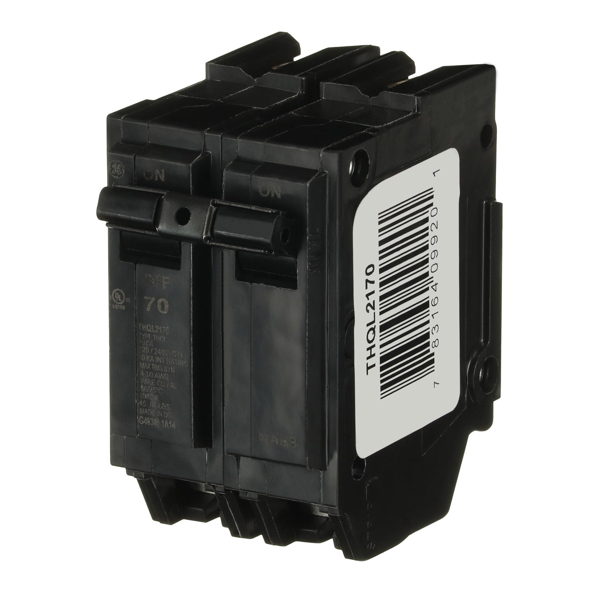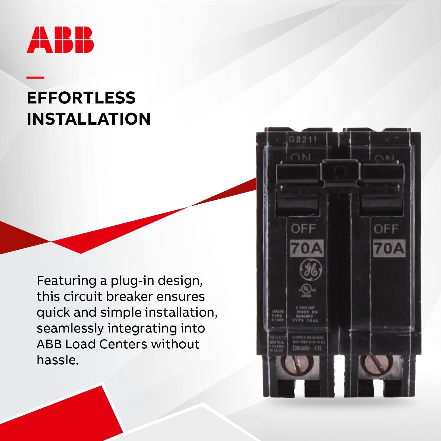 GE Energy Industrial Solutions THQL2170 Double Pole Circuit Breaker, 70 AmpRELIABLE 70 AMP DOUBLE-POLE CIRCUIT BREAKER – The ABB THQL2170 is a dependable 70 Amp circuit breaker that offers 2 poles with box-type terminals. Designed for residential load centers, the plug-in breaker provides reliable electrical protection, ensuring the safety of your electrical system.DOUBLE-POLE CIRCUIT BREAKER WITH PLUG-IN DESIGN FOR EASY INSTALLATION – This circuit breaker features a plug-in design for quick and straightforward installation. Ideal for ABB Load Centers, this 2 pole circuit breaker integrates seamlessly into your existing electrical infrastructure.DURABLE AND SAFE CONSTRUCTION – The breaker case is made of heat-resistant thermoset material for stability and structural integrity. Tin-plated copper stabs create reliable, permanent, and corrosion-resistant connections, ensuring long-lasting performance.INTERNAL COMMON TRIP BAR – The double-pole circuit breaker features an internal common trip bar with a quick make, quick break switch, providing enhanced safety and performance. The calibration screw is cemented to prevent shifting, maintaining consistent operation.ABB: LEADING INNOVATION AND QUALITY – ABB acquired GE Industrial Solutions in 2018. Today all GE electrical distribution products for residential are now ABB. The ABB Group is dedicated to providing innovative and high-quality electrical solutions. Our products are designed to meet the highest standards of safety, reliability, and efficiency.
