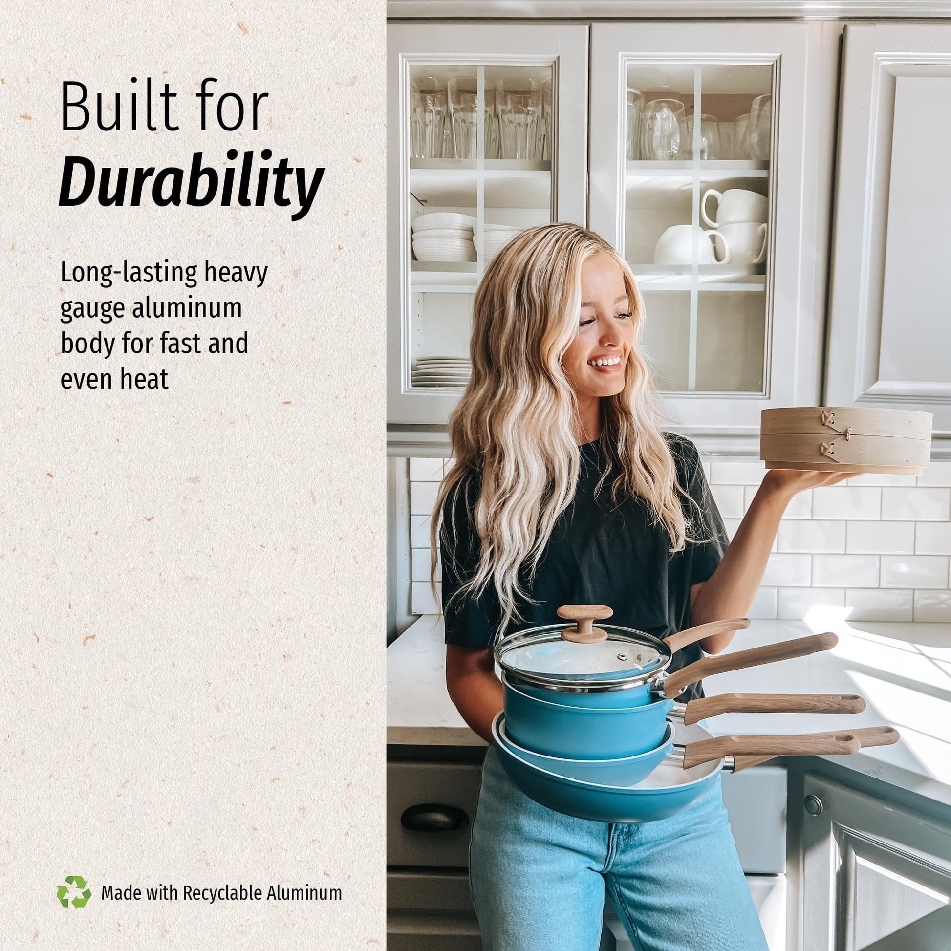 GoodCook Healthy Ceramic Titanium-Infused 2 Quart Saucepan with Lid, Light Blue – Induction Cookware, Nonstick Cooking Pan, Food Cooker for Soups, Sauces, Potatoes, Pasta, Rice2-QUART NONSTICK SAUCEPAN WITH LID: Be prepared for a variety of cooking tasks with this nonstick pan for your kitchen. Perfect to whip up simmering soups and sauces, boiling potatoes, cooking pasta and rice, and other favorite dishes.DURABLE CONSTRUCTION: Made with heavy-gauge, sturdy aluminum body, and coating this induction cookware is free of PFAS, PFOA, PTFE, lead, and cadmium to withstand long-lasting durability.PROMOTES HEALTHIER COOKING: Constructed with a titanium-infused ceramic nonstick surface that allows you to cook with less oil and butter for healthier meals. This cookware also ensures a mess-free release, even for the stickiest foods.DISTRIBUTES HEAT EVENLY: This saucepan with a lid distributes heat evenly and is safe for all stovetops, including induction. It also features an ergonomic soft touch, stay-cool handle for optimal comfort and control.STYLISH LIGHT BLUE FINISH: This kitchen pan has a trendy matte light blue exterior and a light beige interior with gray speckles to add luxurious style to kitchens, and a tempered glass lid lets you watch food as it cooks.