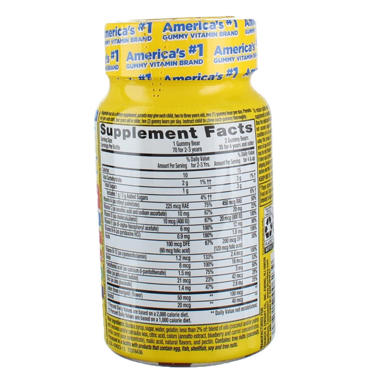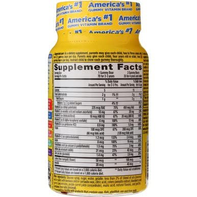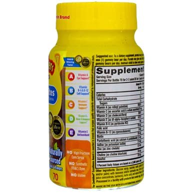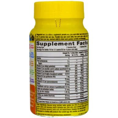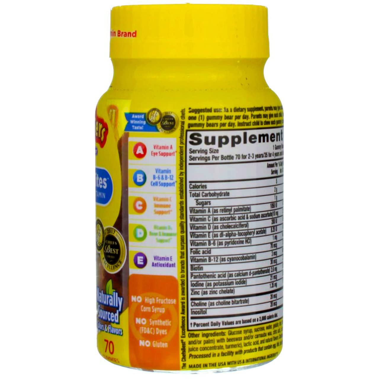 Supports health and development Our gummies contain a fusion of essential nutrients to support health and development. Our gummies are made with cherry, strawberry, orange, pineapple, and blueberry flavors.Fruit Flavored Multi-Vitamins and Minerals for kids60 ct. in fun gummy bear shapesMulti-ColoredPlastic bottle with child proof cap# 1 gummy bear multi-vitamin in many major mass and drug store chains