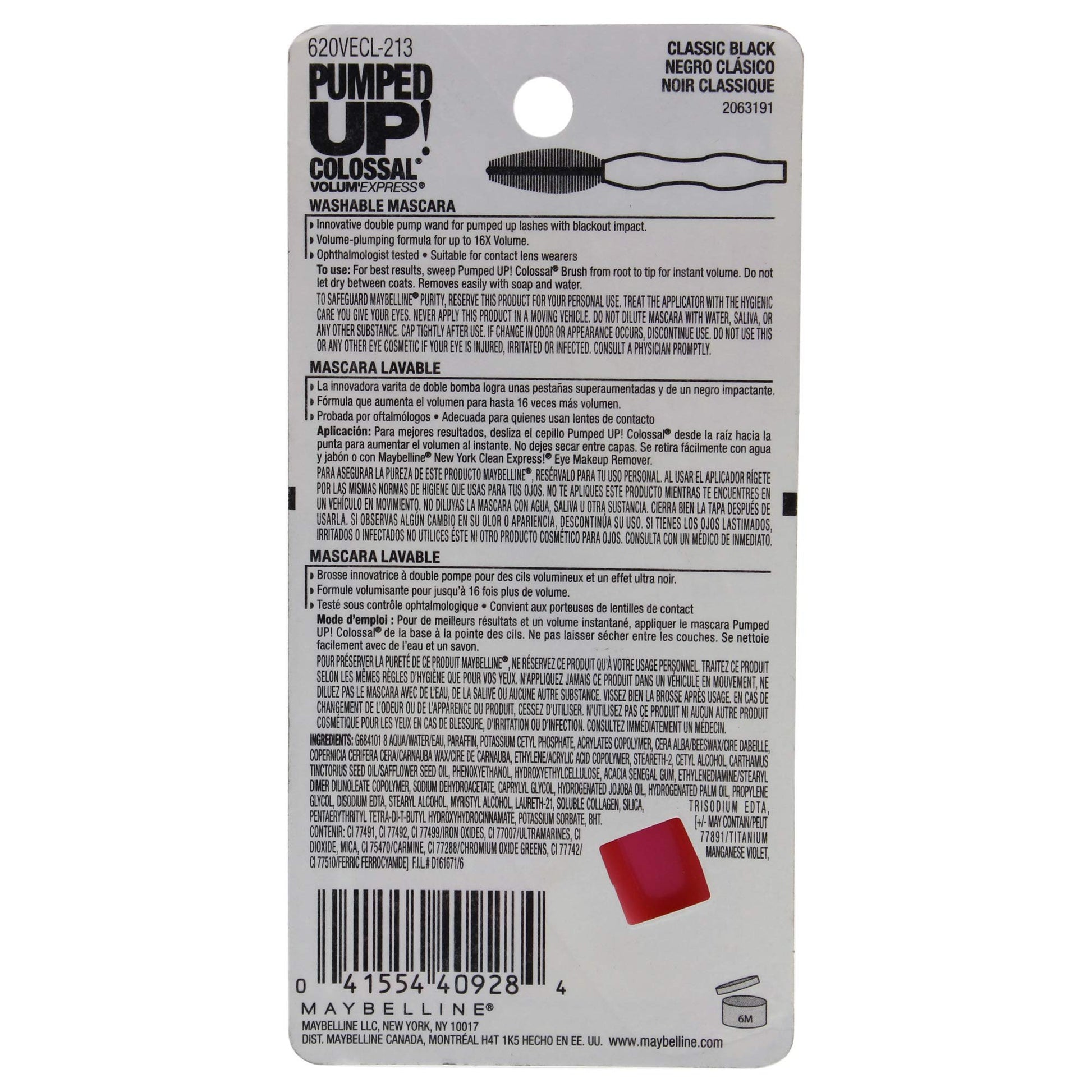 Maybelline Volum' Express Pumped Up Colossal Mascara, Washable Formula Infused with Collagen for Up To 16x Lash Volume, Classic Black, 1 CountColossal Volume: Our double shot volumizing mascara brush scoops up an extra shot of plumping collagen formula in every mascara stroke for bigger, bolder and more extreme lashes; Get up to 16x pumped up lash volumeDefine Your Eye: No eye makeup look is complete without Maybelline Mascara; Amp up the drama with The Falsies Mascara, keep it classic with the iconic Great Lash, or go for a smooth, clump-free natural-but-better look Colossal or Lash Sensational MascaraMaybelline Is The Eye Expert: Whatever your signature eye look, whether natural or dramatic, Maybelline helps create looks that draw eyes; With a broad array of pencil and liquid eyeliners, highly pigmented eyeshadows, iconic mascara, and eyebrow makeupCreate any look with Maybelline: foundation, BB creams, concealers, and setting powders for the perfect canvas, eye shadows, mascara, brow pencils, and eyeliners for any eye look and lip products, from showstopping matte lipstick to a plumping lip glossRemove Maybelline Makeup With Micellar Water: Use Garnier Micellar Water as a gentle makeup remover at night, and as a facial cleanser in the morning to prep skin for Maybelline makeup