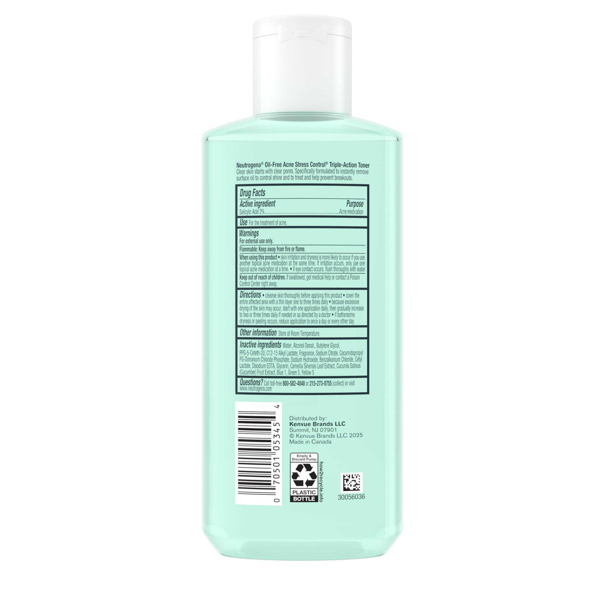 Neutrogena Acne Stress Control Oil-Free Triple-Action Face Toner, Skin Care with 2% Salicylic Acid, Acne Toner for Face with Green Tea & Cucumber Extract, Nourishing & Refreshing, 8 fl. ozOne, 8 fl oz bottle of Neutrogena Acne Stress Control Toner for acne-prone skin, combining soothing ingredients and effective acne-fighting properties to transform your skin care routineThis toner for face is a multitasking pore cleaner that works in three ways to achieve clearer skin: it treats acne before it emerges, unclogs congested pores, and helps reduce oil and shine2% salicylic acid toner with MicroClear technology, to boost the delivery of clinically proven salicylic acid, acting as a face exfoliator unclogs pores & allows treatment to penetrate deep within skin’s surface helping treat acne before it emergesFacial toner helps to reduce redness and irritation, providing a refreshing and soothing experience, making it a perfect skin toner for daily use after cleansingWhether you have acne-prone skin or just need a reliable toner for oily skin, this Neutrogena toner is a go-to face skincare solution, helping to make acne one less stress in your life