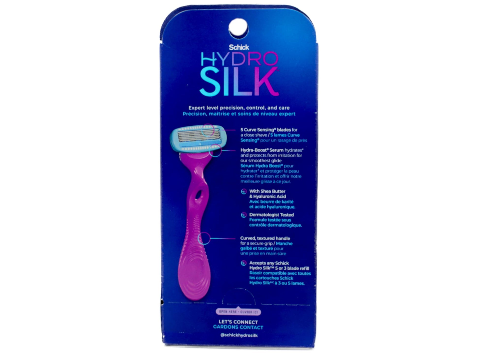Schick Hydro Silk for Women Razor, (Pack of 2)Five curve-sensing blades with unique skin guards to help protect skin from irritation - Unique handle rest keeps cartridge out of water to maintain integrityWater-activated conditioning serum for moisturization during shavingOptimized, smaller oval shape for comfort and ease of use in all zonesSoft rubber with multiple grips provide the ultimate control2 Hydro Silk Razors