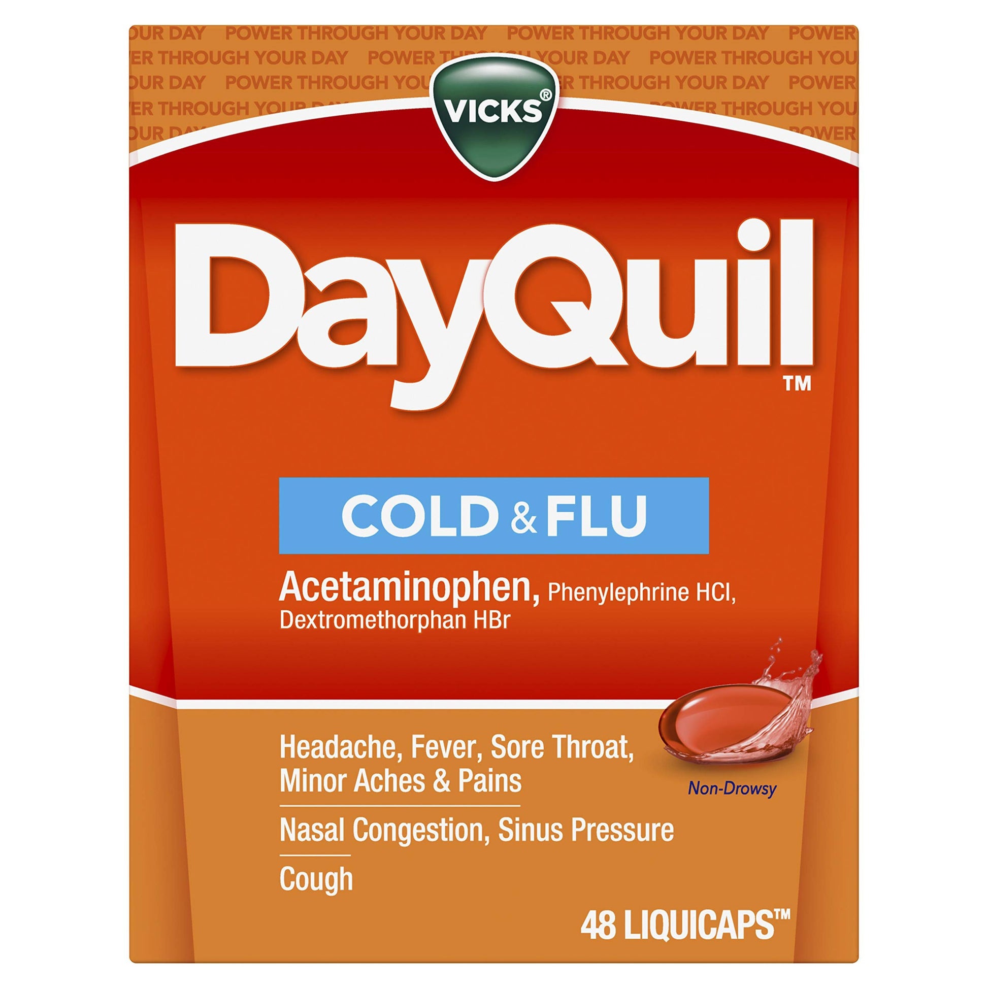Vicks DayQuil Cold & Flu Medicine, Non-Drowsy Powerful Multi-Symptom Daytime Relief for Headache, Fever, Sore Throat, Minor Aches and Pains, Nasal Congestion, Sinus Pressure and Cough, 48 Liquicaps